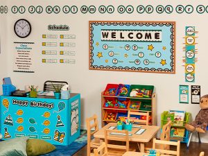 Tôi bắt đầu bằng cách phủ lên các bức tường lớp học bằng những những tờ giấy butcher màu ngọc lam có các sắc thái khác nhau và cảm nhận. Tôi biết đến một trang web – Scholastic Teacher Store gần đây đã giới thiệu một bài trang trí Aqua Oasis hoàn toàn phù hợp với chủ đề màu sắc tôi chọn. Nó bao gồm hai phần khác nhau, một bộ trang trí bảng thông báo chủ đề sinh nhật, bộ các công việc trực nhật, thời gian biểu, lịch, một vài áp phích, một bộ chữ cái và thậm chí là các clip chart.